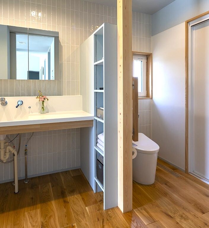 大きな特徴は、洗面からトイレ、浴室の入口まで段差のないフラットな設計にあります。トイレの入口に扉を設けず、空間を一体化することで、日常の動線をスムーズにするだけでなく、将来の車椅子利用を見据えたバリアフリー仕様となっています。一般的な住宅ではあまり見られない造りですが、生活の質を長期的に支える工夫が凝縮されています。
